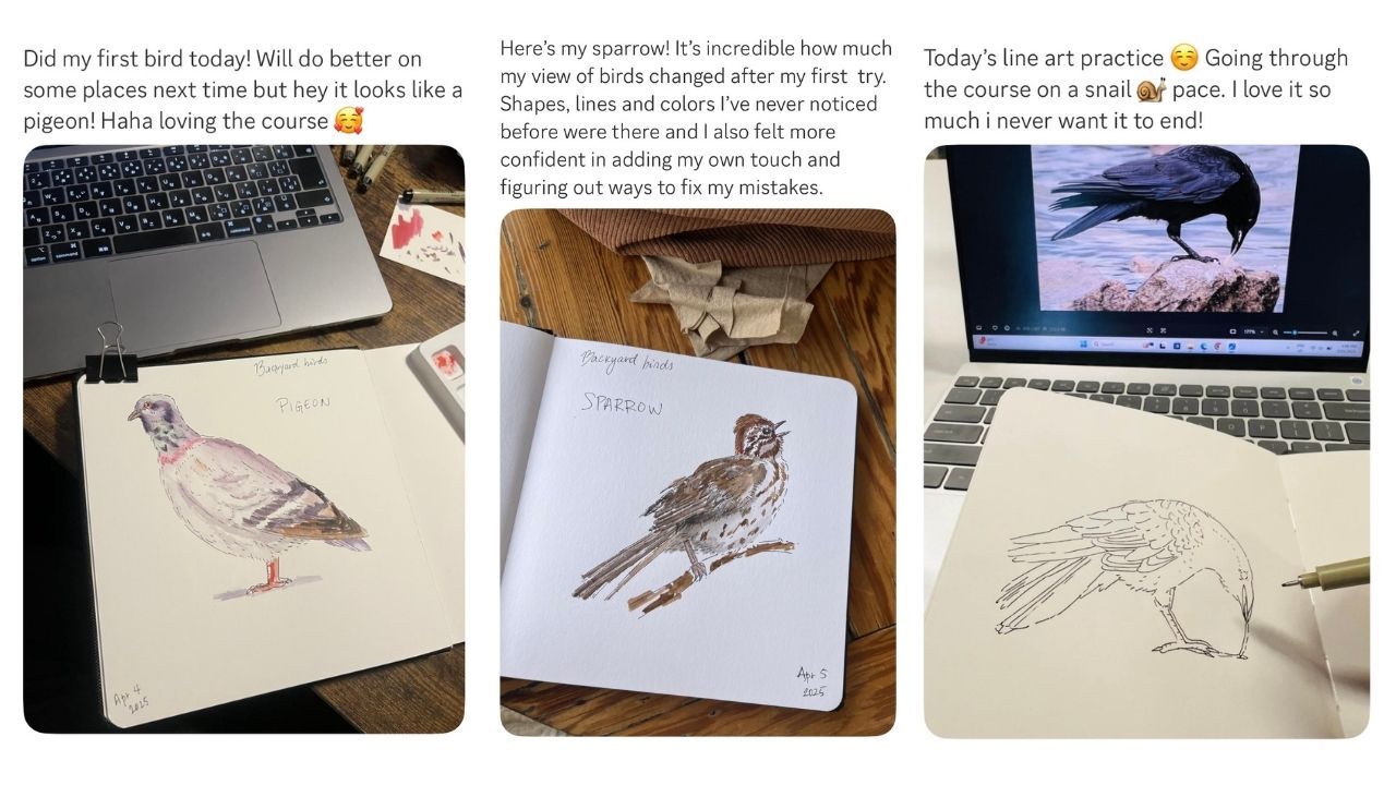 I loved it so much that I challenged myself to draw one bird every day in 2024.Ā Now I have so many tips and ideas to share with you!Ā Thatās why I created this course, toĀ guide you step by step, making bird sketching easyĀ andĀ fun. Even if youāve never picked up a pencil before!